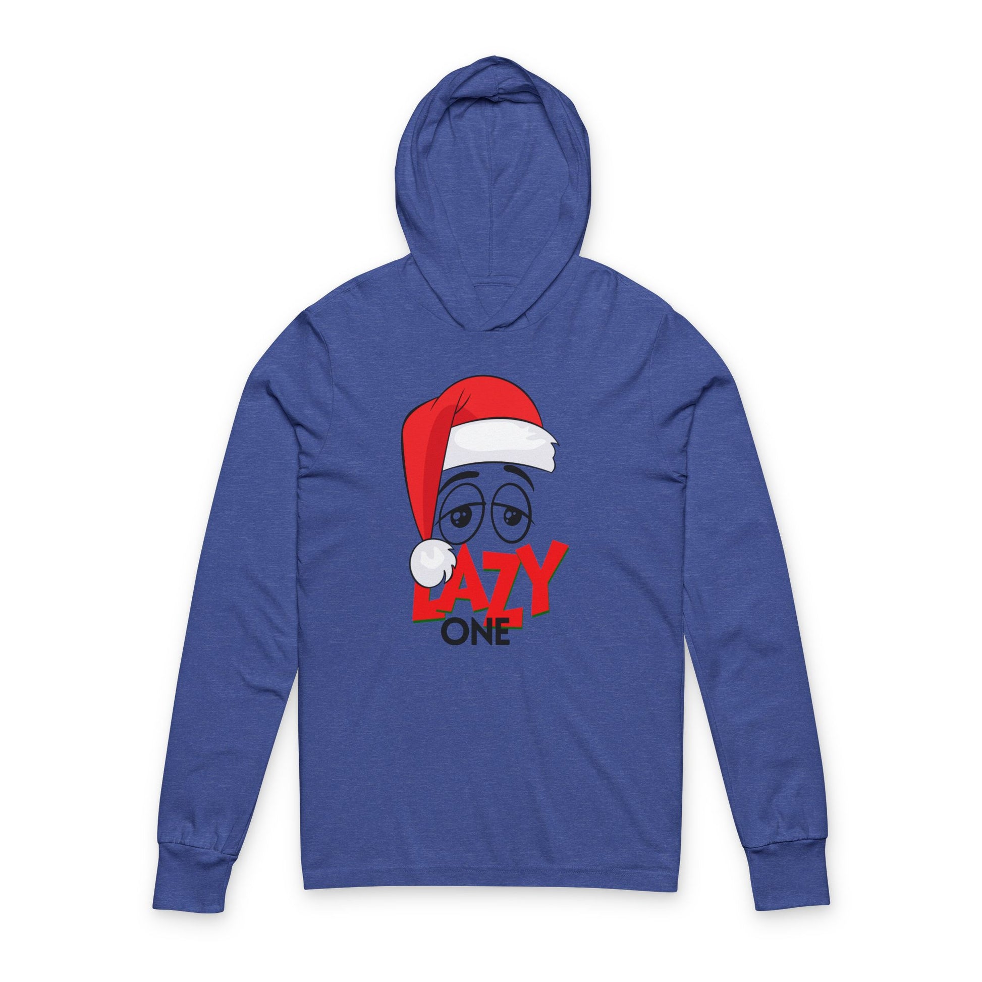 Soft, lightweight hoodie tee with a playful holiday twist. A sleepy-eyed character in a Santa hat and bold red lettering reading “LAZY ONE” sits on the chest, bringing a wink of humor to quiet winter mornings. The slim, regular fit and side-seamed construction keep the silhouette tidy while the crossover V at the neckline and long sleeves add subtle everyday comfort. Wear it when you want cozy layering without bulk — ideal for slow coffee, relaxed family gatherings, or low-key holiday evenings where staying comfy matters more than dressing up.
