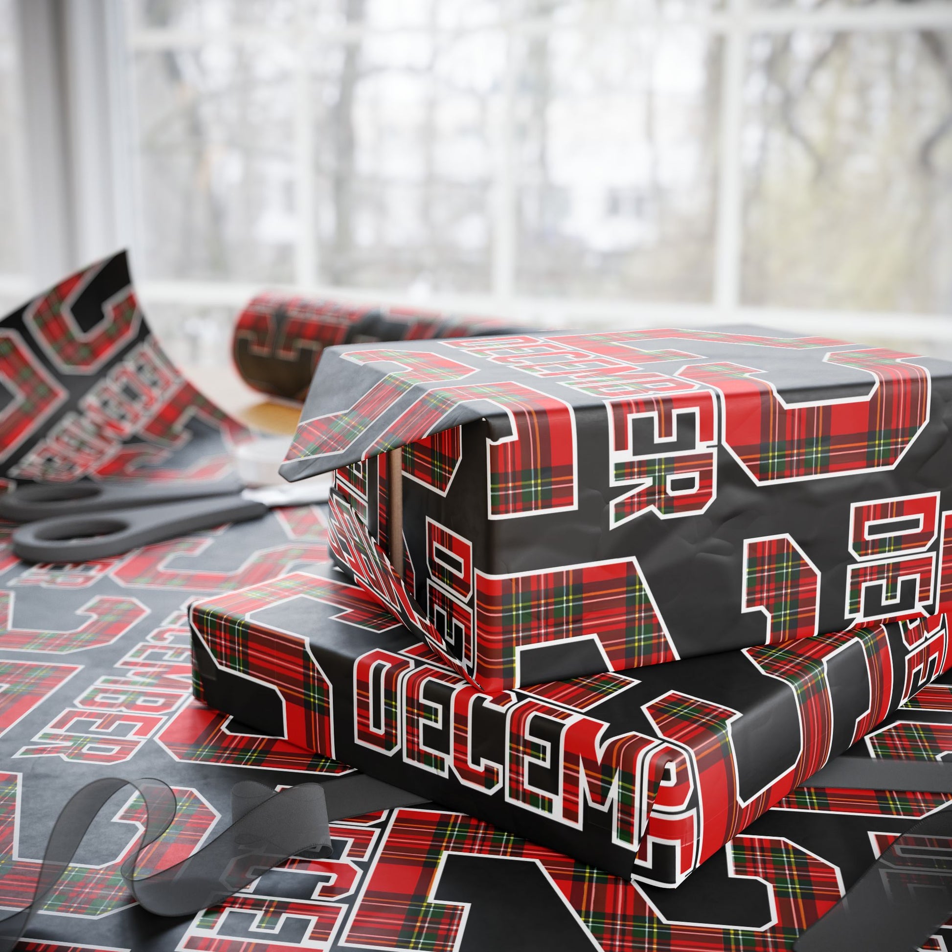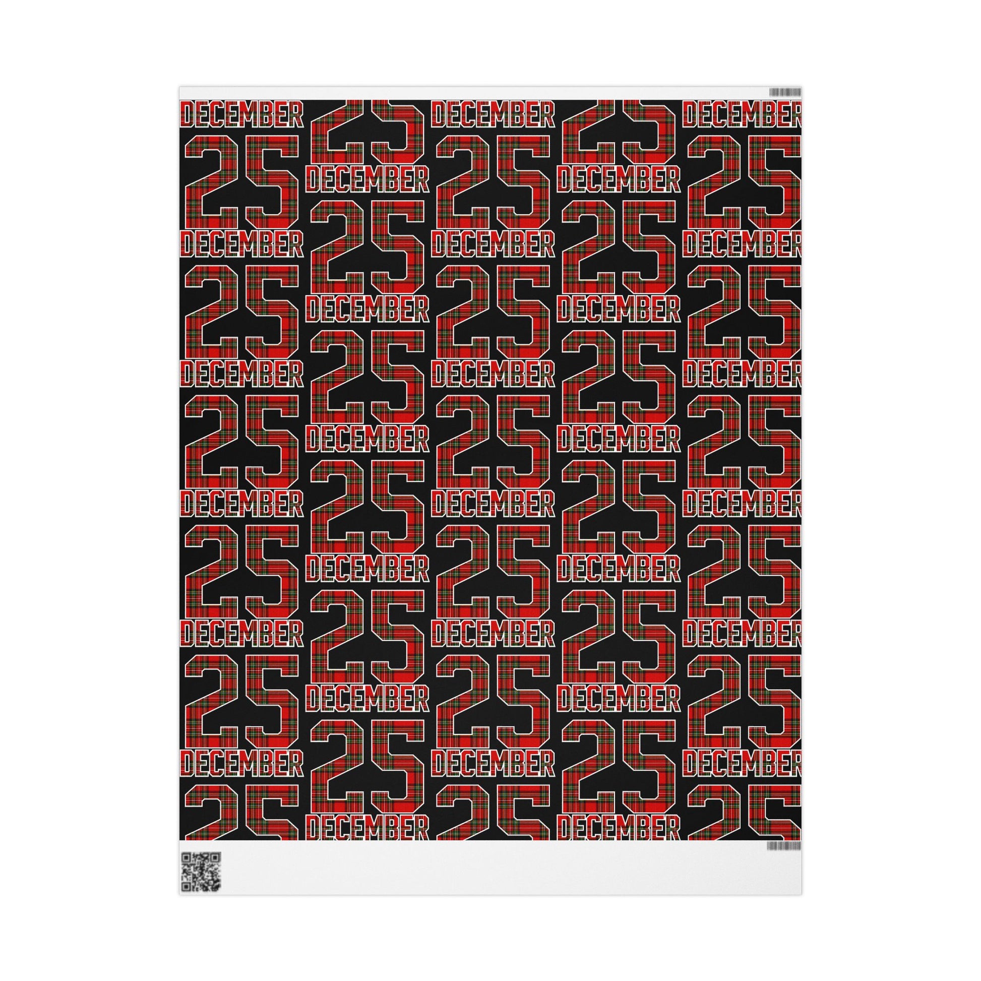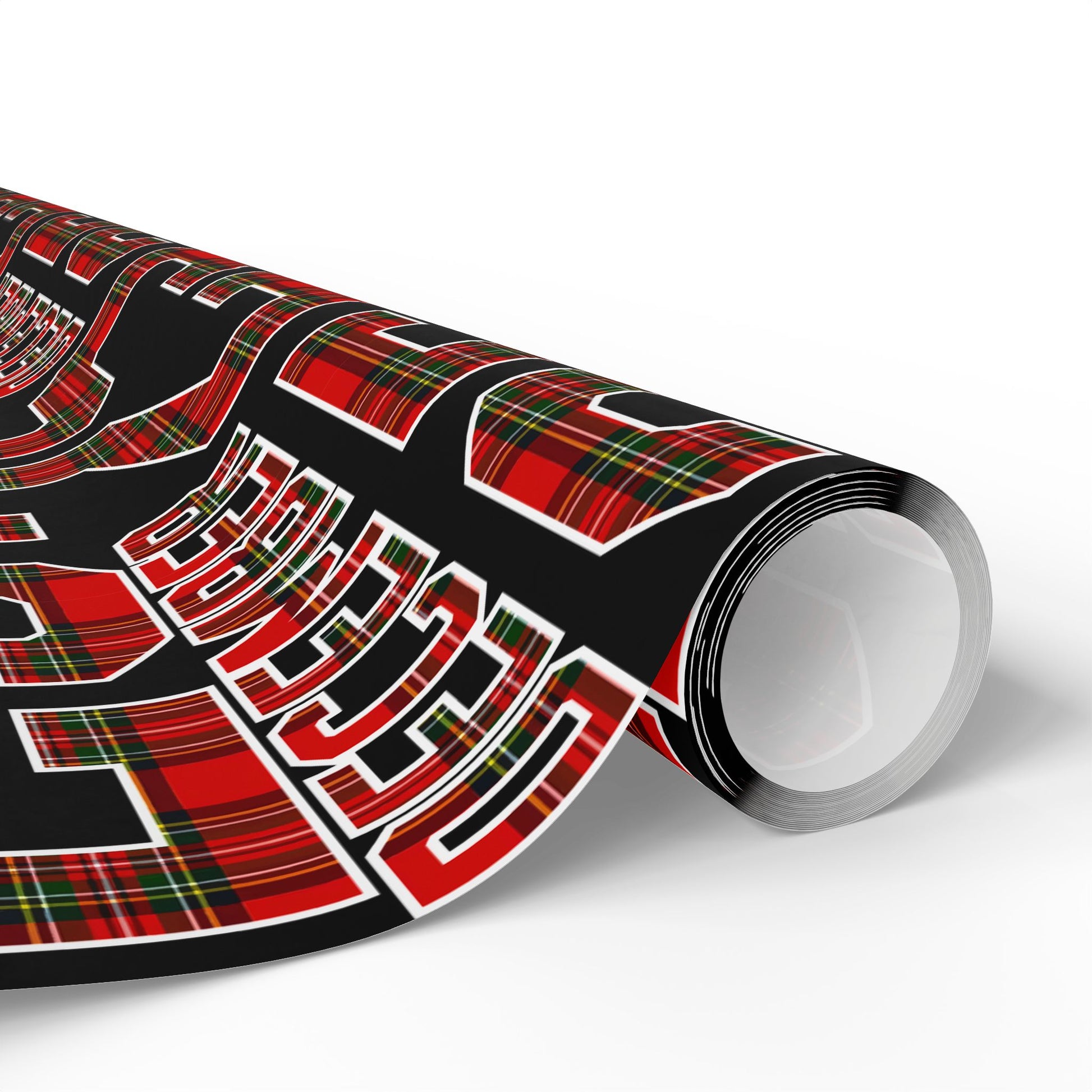 A roll of festive wrapping paper that brings bold tartan and typographic energy to every gift. Printed on 90gsm fine art paper, the design combines classic red-and-green plaid with strong black backgrounds and repeating lettering for a contemporary holiday-meets-trad look. Choose glossy for a vibrant, reflective finish or matte for a refined, photo-like surface. Available in three generous lengths — 30×36, 30×72, and 30×180 inches — this one-sided print covers small to large packages and adds an eye-catching layer under ribbons and gift tags. Note: each roll includes white trim at the top and bottom with a small bar and QR code.