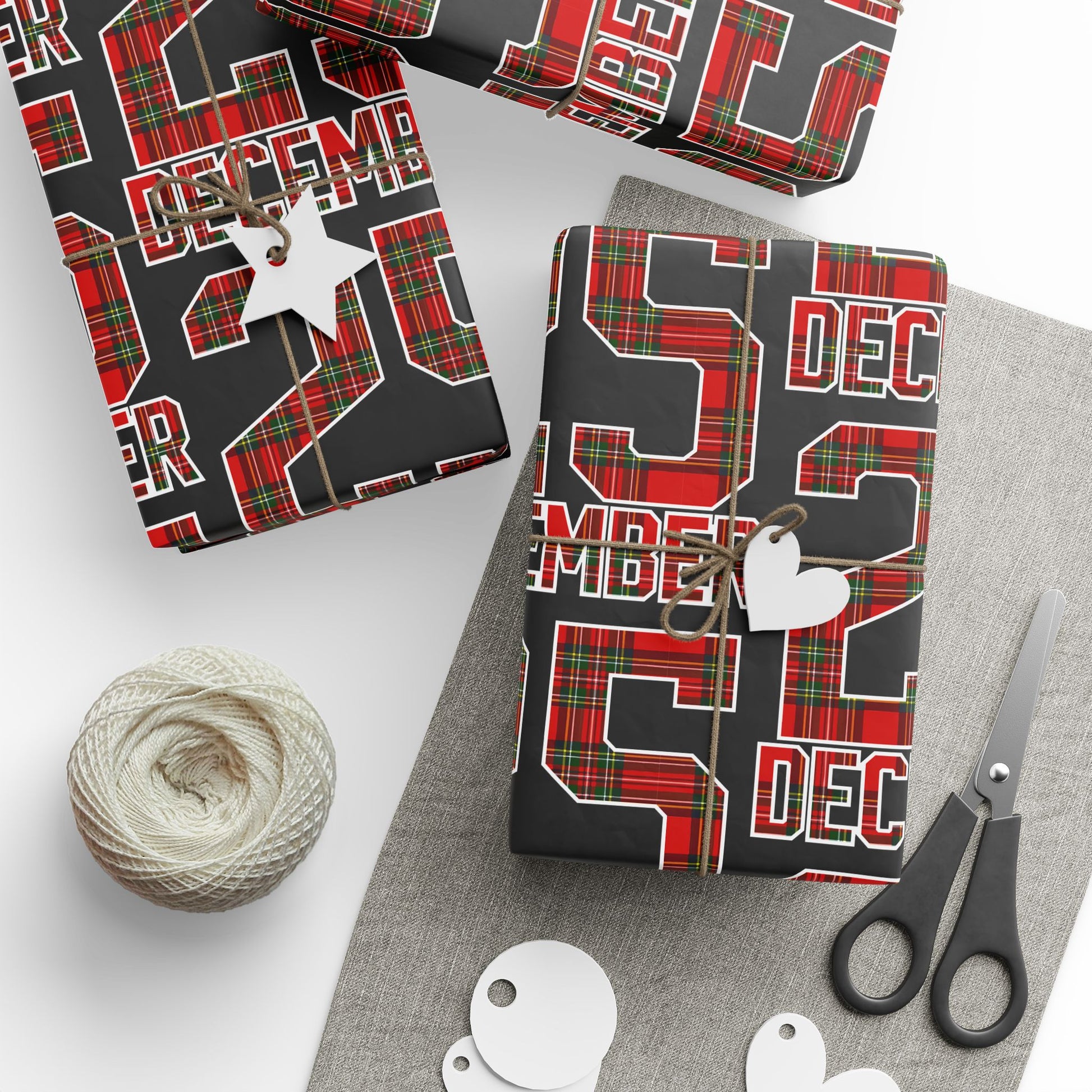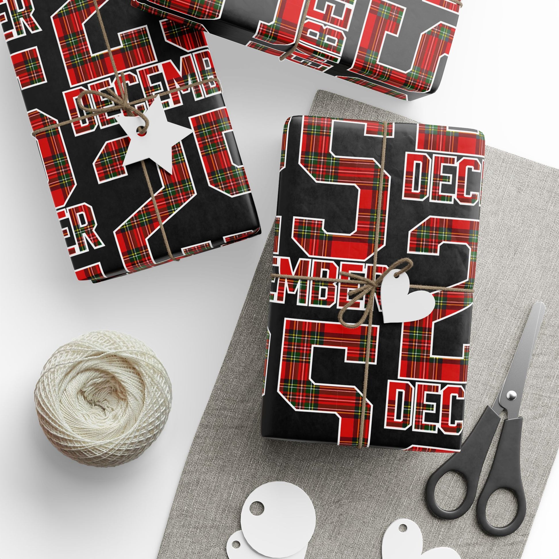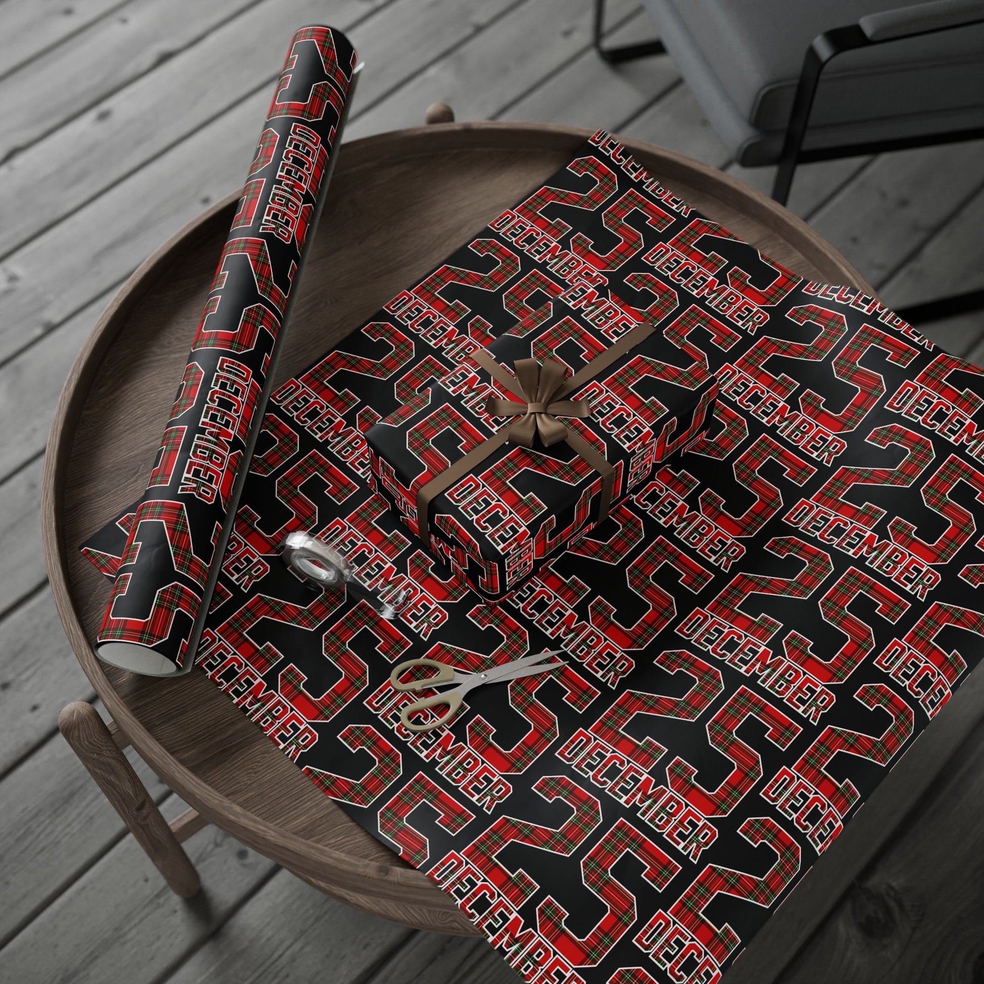 A roll of festive wrapping paper that brings bold tartan and typographic energy to every gift. Printed on 90gsm fine art paper, the design combines classic red-and-green plaid with strong black backgrounds and repeating lettering for a contemporary holiday-meets-trad look. Choose glossy for a vibrant, reflective finish or matte for a refined, photo-like surface. Available in three generous lengths — 30×36, 30×72, and 30×180 inches — this one-sided print covers small to large packages and adds an eye-catching layer under ribbons and gift tags. Note: each roll includes white trim at the top and bottom with a small bar and QR code.